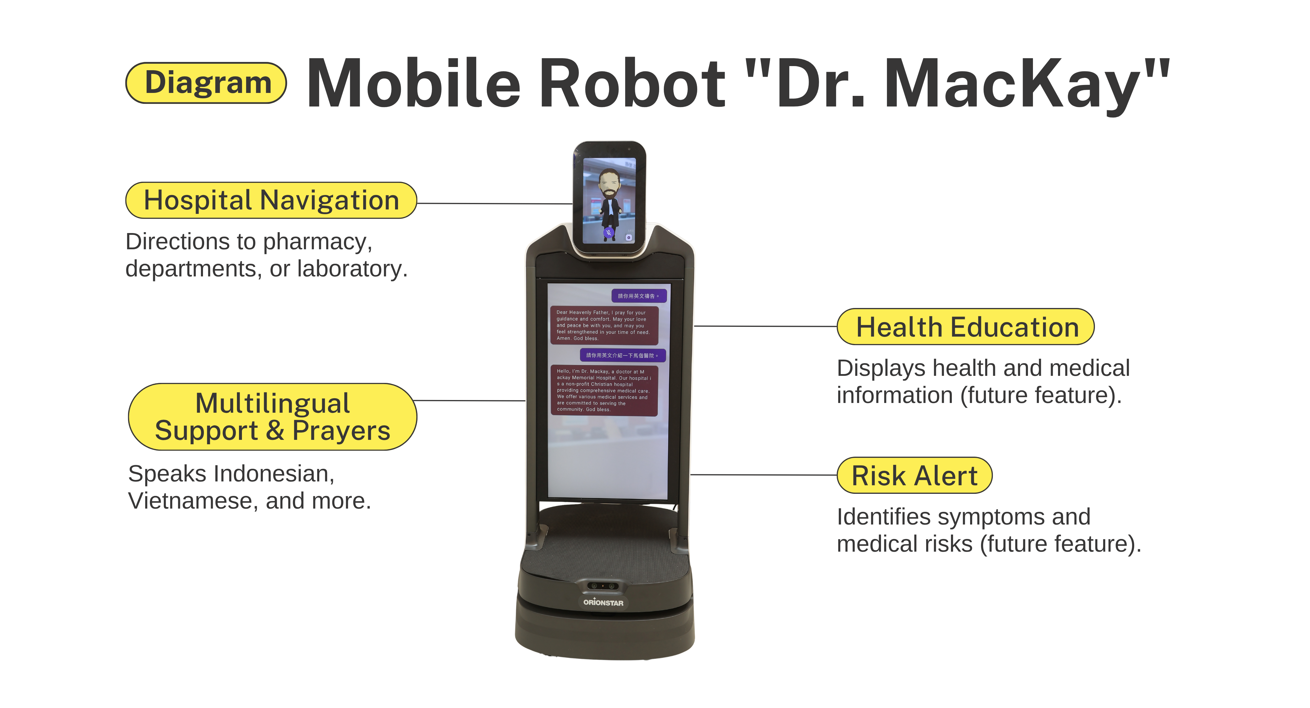 Another robot, named “Dr. MacKay,” is a wheeled guide robot with a sleek design, equipped with a large touch screen and a voice recognition system. Patients can use it to check symptoms, locate the appropriate department, or find destinations within the hospital. For example, if someone says, “I have a headache — which department should I visit?” it can respond instantly; if the person says, “I want to go to the pharmacy,” it can lead the way directly, and it can also provide health education guidance.