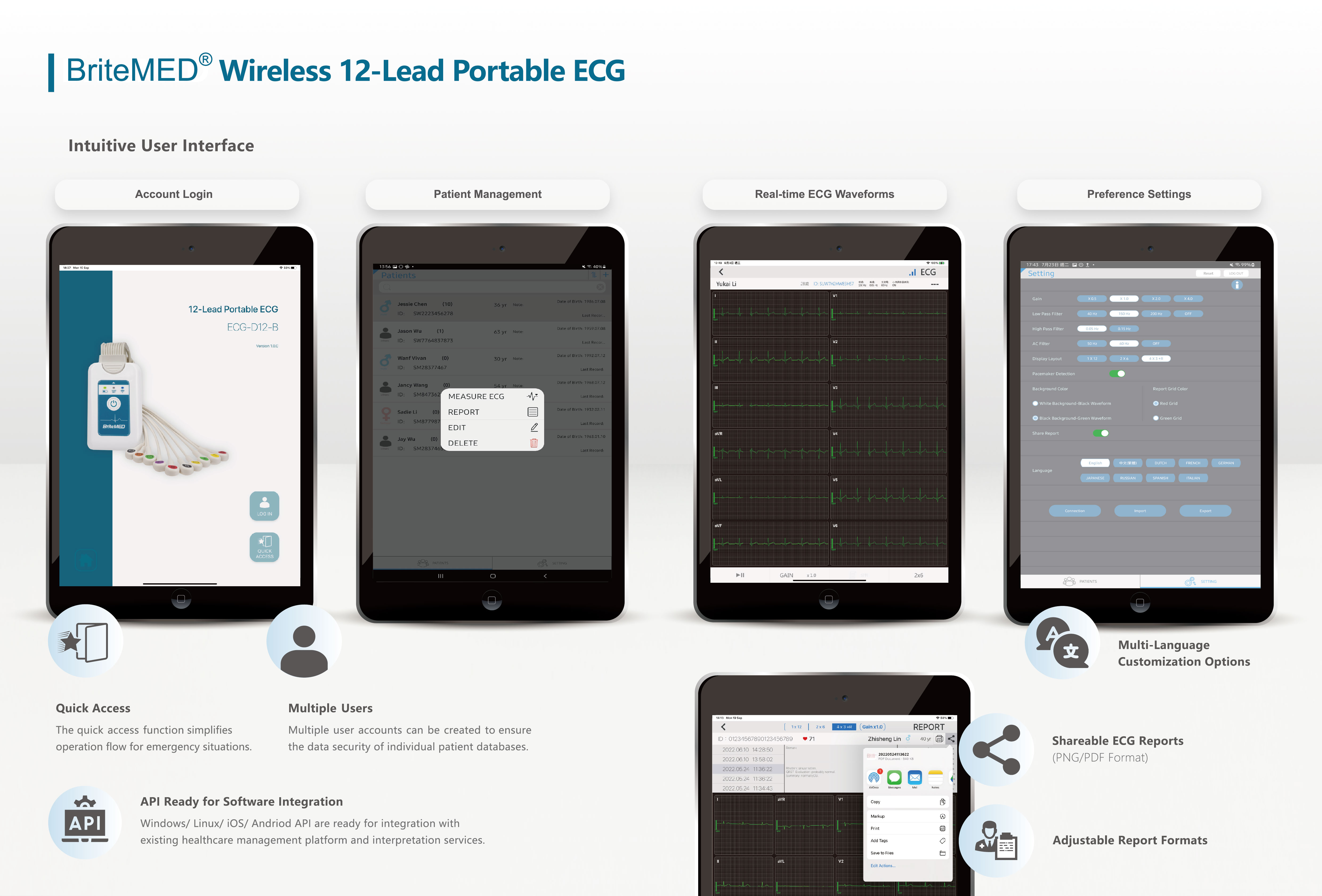 • 安全報告與病歷管理: 配備專業軟體,能有效管理患者檔案和ECG報告,可創建多個使用者賬戶,確保個別患者資料的安全性。並可調整成不同格式的ECG報告。
