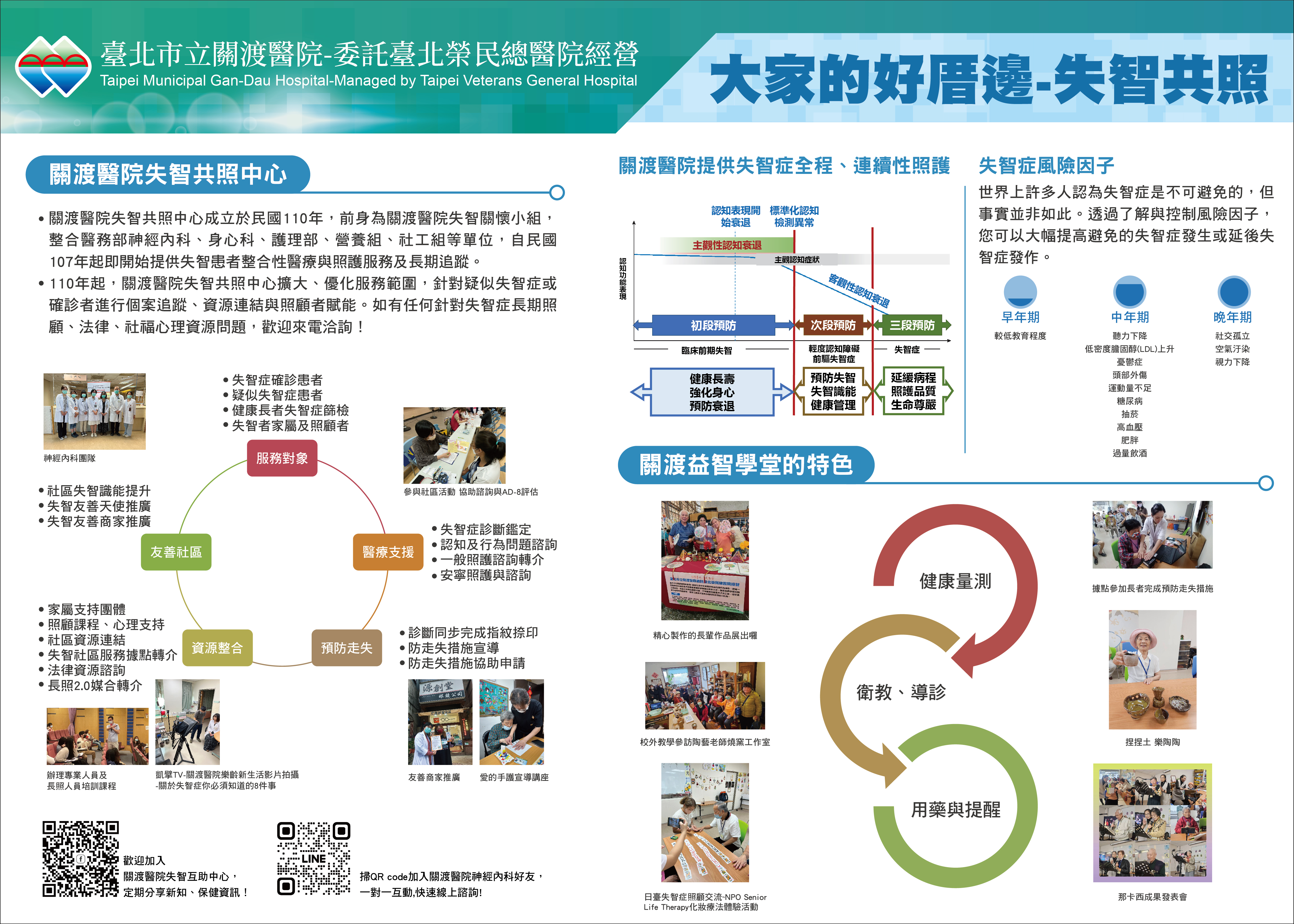 110年起,關渡醫院失智共照中心擴大、優化服務範圍,針對疑似失智症或確診者進行個案追蹤、資源連結與照顧者賦能。如有任何針對失智症長期照顧、法律、社福心理資源問題,歡迎來電洽詢!