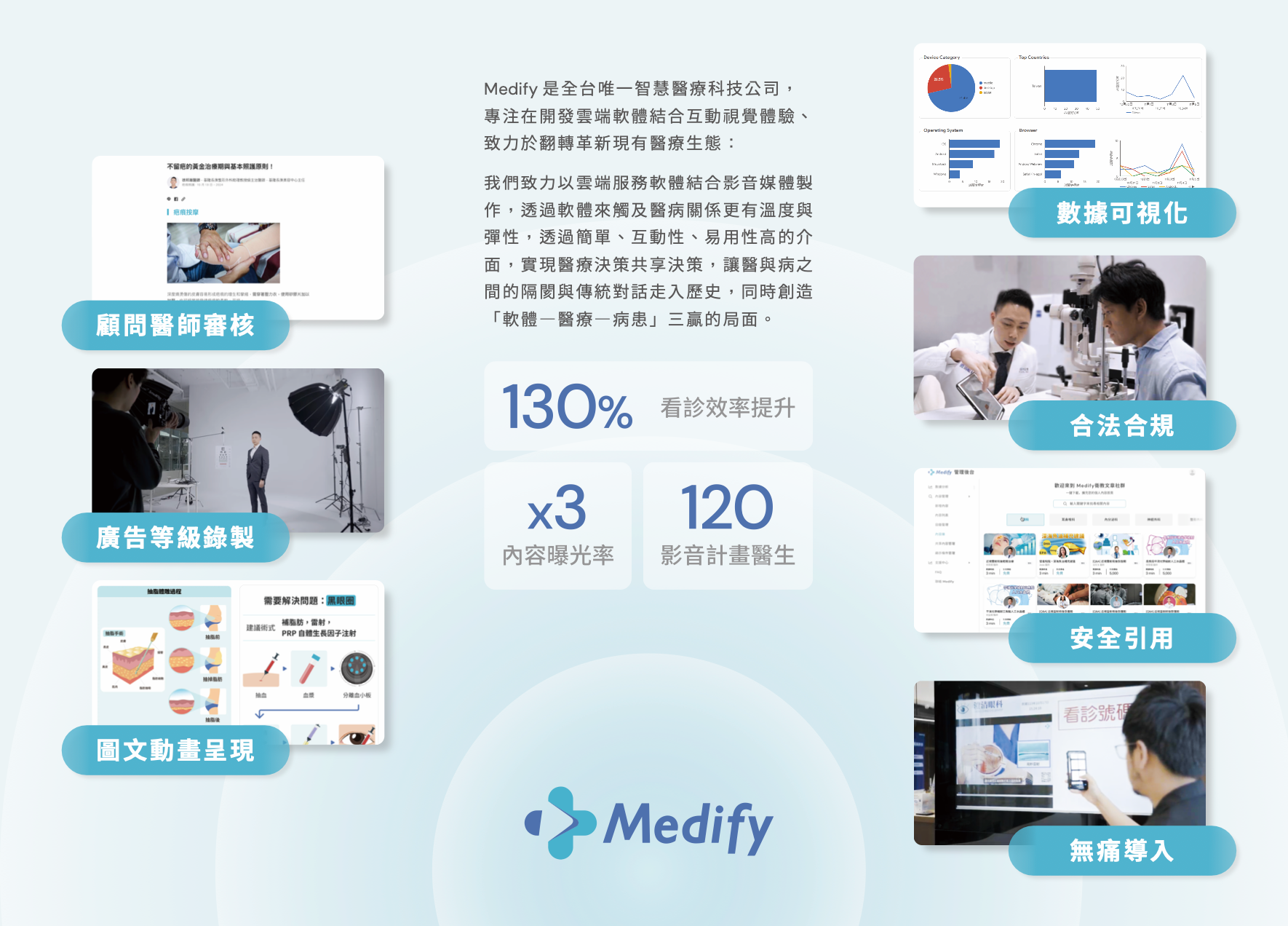 透過 Medify後台精準的數據分析與多樣化的內容輔助,協助醫師減少重複工作、提高診療效率。例如,平台透過由淺入深的說明、動態圖像、表格比較及影音輔助內容,使病患更易理解複雜的醫療資訊及自費項目選擇。