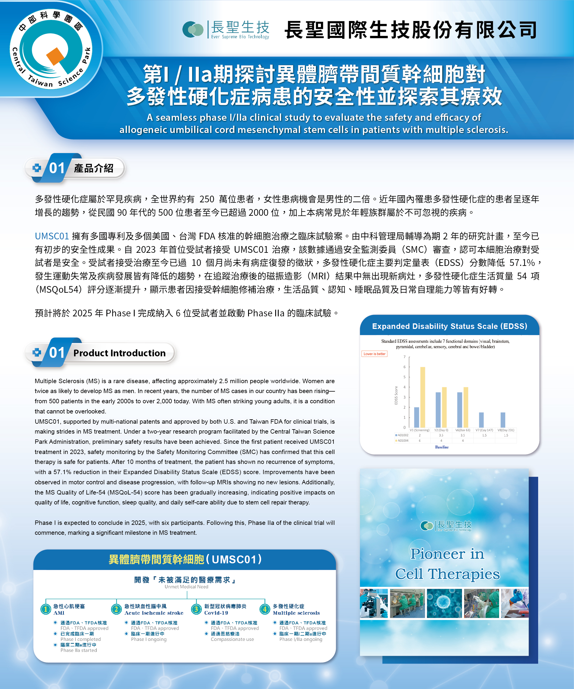 UMSC01擁有多國專利及多個美國、台灣FDA核准的幹細胞治療之臨床試驗案。由中科管理局輔導為期2年的研究計畫,至今已有初步的安全性成果。自2023年首位受試者接受UMSC01治療,該數據通過安全監測委員(SMC)審查,認可本細胞治療對受試者是安全。受試者接受治療至今已過10個月尚未有病症復發的徵狀,多發性硬化症主要判定量表(EDSS)分數降低57.1%,發生運動失常及疾病發展皆有降低的趨勢,在追蹤治療後的磁振造影(MRI)結果中無出現新病灶,多發性硬化症生活質量54項(MSQoL54)評分逐漸提升,顯示患者因接受幹細胞修補治療,生活品質、認知、睡眠品質及日常自理能力等皆有好轉。